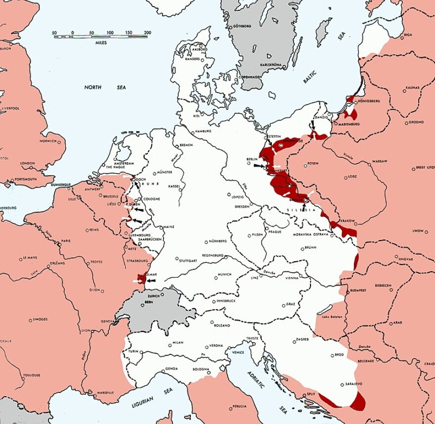 Οι περιοχές που κατείχαν οι Σύμμαχοι και οι Γερμανοί τον Φεβρουάριο του 1945