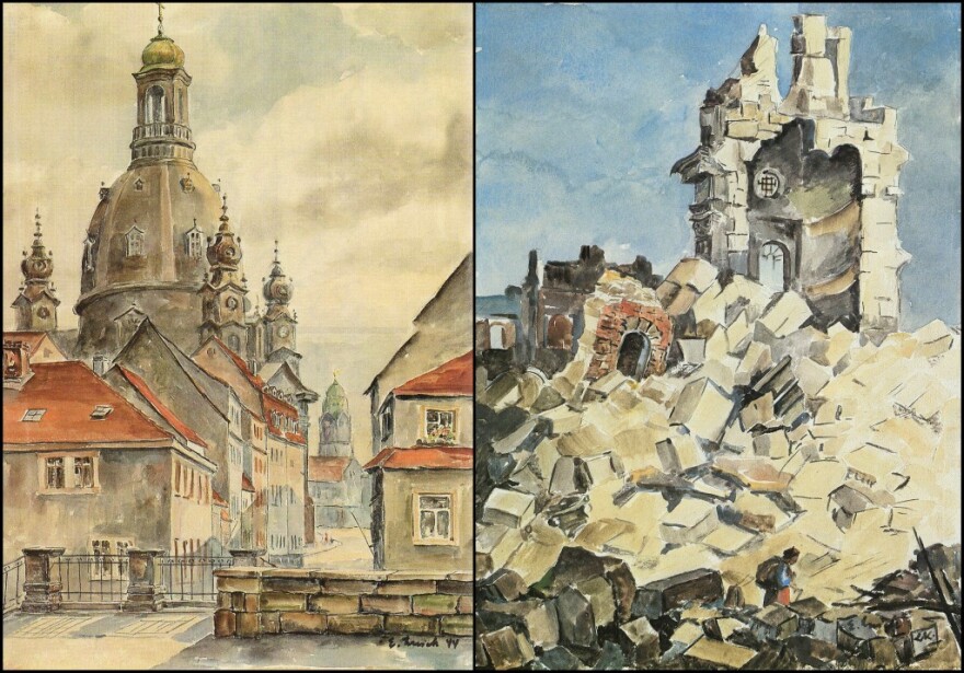 Το Frauenkirche της Δρέσδης πριν και μετά τον βομβαρδισμό σε πίνακα του Eugen Luick
