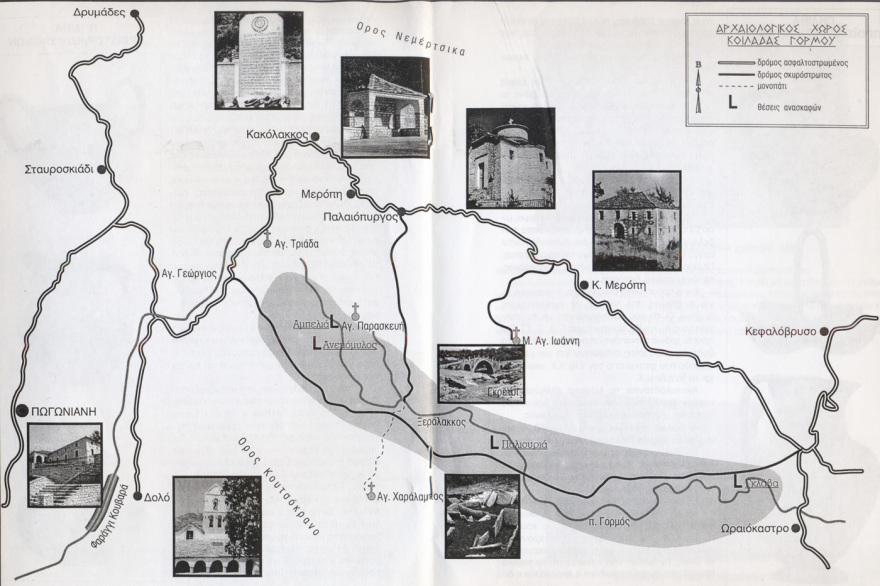 Ο Κ. Κωστούλας αναφέρει και μια σειρά σημαντικών ευρημάτων κυρίως στην κοιλάδα του Γορμού. Το κάστρο του Ωραιόκαστρου (Λαχανόκαστρου) που χρονολογείται από την ελληνιστική περίοδο κατά τον Νίκολας Χάμοντ, διάσπαρτα ερείπια παρόμοια μ’ εκείνα της φρυκτωρίας του Παλαιόπυργου σε διάφορες θέσεις, τα ερείπια στο Παλαιοχώρι Νεμέρτσικας με υδραγωγείο από τις πηγές Μπιτσικόπουλο, απολιθωμένα δέντρα, πέντε τοξωτά γεφύρια, τρίτοξη γέφυρα με το όνομα Γκρέτσι (των Γραικών) σε μονοπάτι που χαρακτηρίζεται ως Παρ(α)εγνατία και συνέδεε Κορυτσά με Άγιους Σαράντα, με θερινό τμήμα μονοπατιού στη Νεμέρτσικα και χειμερινό σε χαμηλότερο υψόμετρο κ.ά. Στο τοπικό μουσείο του χωριού Μερόπη υπάρχει κέρατο βοδιού που χρονολογήθηκε από το Πανεπιστήμιο Θεσσαλονίκης γύρω στο 900.000 π.Χ. (!). Μεγάλο ενδιάφερον παρουσιάζει και το γεγονός της ύπαρξης αμμωνιτών (απολιθωμένα μαλάκια με σπειροειδές όστρακο που έζησαν κατά τον παλαιοζωικό και τον μεσοζωικό αιώνα) στην περιοχή του Πωγωνίου που δείχνουν ότι πριν από εκατομμύρια χρόνια εκεί υπήρχε θάλασσα. Αμμωνίτες υπάρχουν στο (Ιστορικό) Μουσείο Φυσικής Ιστορίας, της Καστάνιανης Πωγωνίου, το οποίο η αθάνατη ελληνική γραφειοκρατία, κρατά «κλειστό», μη επισκέψιμο για το κοινό. Πρόκειται για ένα από τα παλαιότερα Μουσεία Φυσικής Ιστορίας της Ελλάδας και θα αναδείξουμε σύντομα τα απίστευτα εμπόδια που συναντά ο πρόεδρος της Κοινότητας Καστάνιανης Μιχάλης Κολιός στην προσπάθειά του να λειτουργήσει το Μουσείο…